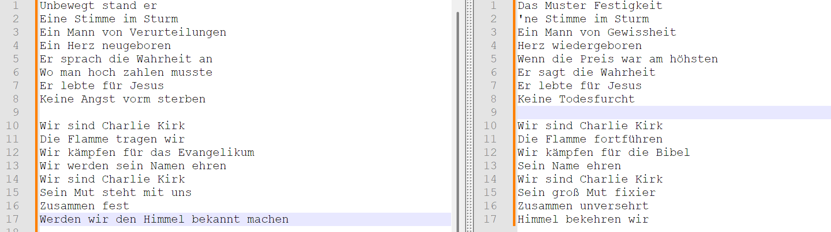 disappointed that the German closed caption translation of We Are Charlie Kirk is literal rather than poetic